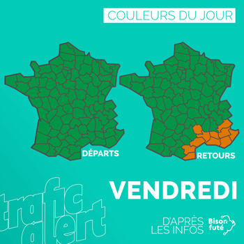 TENDANCE VENDREDI Un trafic avec ses deux pics, celui de fin de journée amplifié par quelques départs. Une journée classée orange par Bison Futé sud pour quitter le bord de la Méditerranée vers les Alpes.