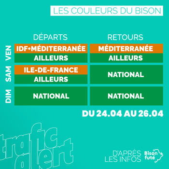 TENDANCE VENDREDI Un trafic avec ses deux pics, celui de fin de journée amplifié par quelques départs. Une journée classée orange par Bison Futé en Île-de-France pour le départs et pour le bord de la Méditerranée dans les deux sens.