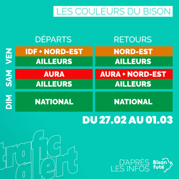 À RETENIR Bison Futé est au vert jusqu'au jeudi 26 février veille d'une journée avec de l'orange sur l'est et Île-de-France.